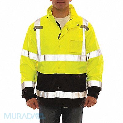 J5375 Jacket Garment Type Jacket Length Type Waist Style High Visibility Jacket Back Stripe Pattern U ANSI Class 3 ANSI Type R Gender Men s Front Closure Type Zipper with Storm Flap Color Green Yellow Size XL Number of Outside Pockets 5 Includes Hood Yes Hood Style Packable Hood in Collar Maximum Chest Size 56 in Material Polyester Includes Removable Liner Yes Reflective Tape Type Glass Bead Reflective Stripe Border Type None Garment Features Black Bottom
