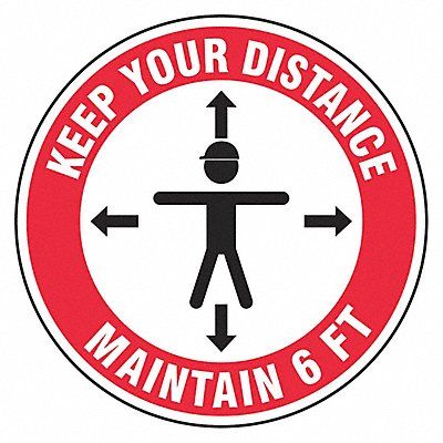 Hard Hat Sticker Diameter 2 1/4 in Height Not Applicable Material Adhesive Vinyl Number of Labels 10 Preprinted Images Person with Hardhat on with Arrows Pointing Away from Top Bottom Right and Left Preprinted Text Keep Your Distance Maintain 6 Ft Preprinted Text Color Red Retroreflective Grade Non-Reflective Self-Adhesive Yes Shape Circle Subject Matter Social Distancing Visibility Standard Width Not Applicable Background Color White Language English Write on Surface No