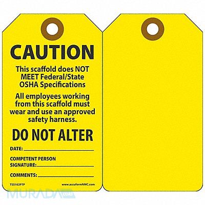 Tag Compatible Tag Holder Mfr Part Number TSS902 Compatible Tag Insert Mfr Part Number Not Applicable Fastener Attachment Length Not Applicable Fastener Type Not Applicable Header Wording (Reverse Side) No Header Header Wording Caution Height 5 3/4 in Indoor/Outdoor Usage Indoor/Outdoor Lamination Type Not Laminated Language English Mounting Hole Reinforcement Type Brass Grommet Mounting Hole Size 3/8 in Number of Tags 25 Preprinted Images (Reverse Side) Not Applicable