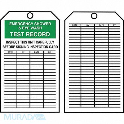 Tag Compatible Tag Holder Mfr Part Number Not Applicable Compatible Tag Insert Mfr Part Number Not Applicable Fastener Attachment Length Not Applicable Fastener Type Not Applicable Header Wording (Reverse Side) No Header Header Wording Emergency Shower Eye Wash Test Record Height 6 1/4 in Indoor/Outdoor Usage Indoor/Outdoor Lamination Type Not Laminated Language English Mounting Hole Reinforcement Type No Reinforcement Mounting Hole Size 3/8 in Number of Tags 250