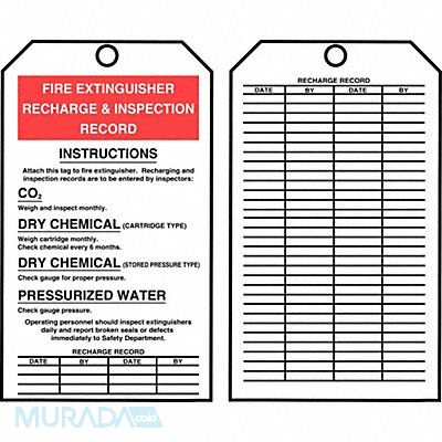 Tag Compatible Tag Holder Mfr Part Number Not Applicable Compatible Tag Insert Mfr Part Number Not Applicable Fastener Attachment Length Not Applicable Fastener Type Not Applicable Header Wording (Reverse Side) Recharge Inspection Record Header Wording Fire Extinguisher Recharge Inspection Record Height 6 1/4 in Indoor/Outdoor Usage Indoor/Outdoor Lamination Type Not Laminated Language English Mounting Hole Reinforcement Type No Reinforcement Mounting Hole Size 3/8 in