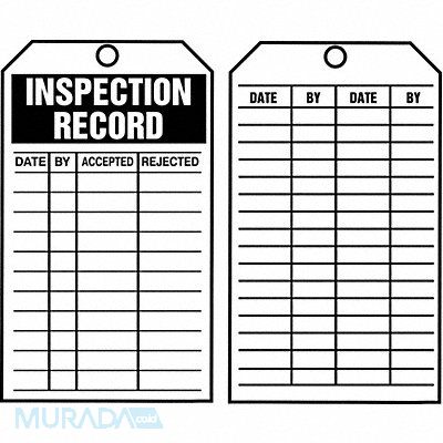 Tag Compatible Tag Holder Mfr Part Number Not Applicable Compatible Tag Insert Mfr Part Number Not Applicable Fastener Attachment Length Not Applicable Fastener Type Not Applicable Header Wording (Reverse Side) No Header Header Wording Inspection Record Height 6 1/4 in Indoor/Outdoor Usage Indoor/Outdoor Lamination Type Not Laminated Language English Mounting Hole Reinforcement Type No Reinforcement Mounting Hole Size 3/8 in Number of Tags 250