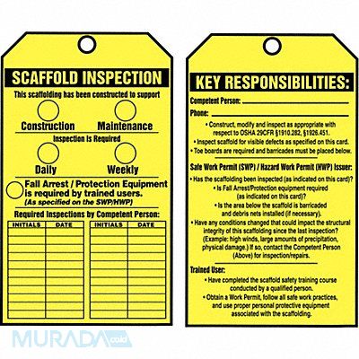 Tag Compatible Tag Holder Mfr Part Number Not Applicable Compatible Tag Insert Mfr Part Number Not Applicable Fastener Attachment Length Not Applicable Fastener Type Not Applicable Header Wording (Reverse Side) Key Responsibilities Header Wording Scaffold Inspection Height 6 1/4 in Indoor/Outdoor Usage Indoor/Outdoor Lamination Type Not Laminated Language English Mounting Hole Reinforcement Type No Reinforcement Mounting Hole Size 3/8 in Number of Tags 250