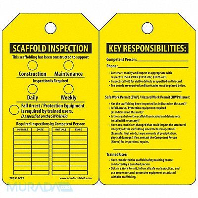 Tag Compatible Tag Holder Mfr Part Number TRS902 Compatible Tag Insert Mfr Part Number Not Applicable Fastener Attachment Length Not Applicable Fastener Type Not Applicable Header Wording (Reverse Side) Key Responsibilities Header Wording Scaffold Inspection Height 5 3/4 in Indoor/Outdoor Usage Indoor/Outdoor Lamination Type Not Laminated Language English Mounting Hole Reinforcement Type No Grommet Mounting Hole Size 3/8 in Number of Tags 25