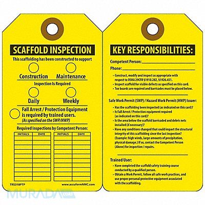 Tag Compatible Tag Holder Mfr Part Number TRS902 Compatible Tag Insert Mfr Part Number Not Applicable Fastener Attachment Length Not Applicable Fastener Type Not Applicable Header Wording (Reverse Side) Key Responsibilities Header Wording Scaffold Inspection Height 5 3/4 in Indoor/Outdoor Usage Indoor/Outdoor Lamination Type Not Laminated Language English Mounting Hole Reinforcement Type Brass Grommet Mounting Hole Size 3/8 in Number of Tags 25