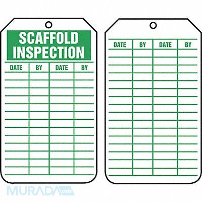 Tag Compatible Tag Holder Mfr Part Number TRS902 Compatible Tag Insert Mfr Part Number Not Applicable Fastener Attachment Length Not Applicable Fastener Type Not Applicable Header Wording (Reverse Side) No Header Header Wording Scaffold Inspection Height 5 3/4 in Indoor/Outdoor Usage Indoor/Outdoor Lamination Type Not Laminated Language English Mounting Hole Reinforcement Type Brass Grommet Mounting Hole Size 3/8 in Number of Tags 25