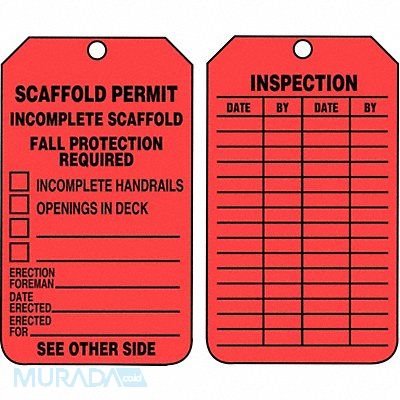 Tag Compatible Tag Holder Mfr Part Number TRS902 Compatible Tag Insert Mfr Part Number Not Applicable Fastener Attachment Length Not Applicable Fastener Type Not Applicable Header Wording (Reverse Side) Inspection Header Wording Scaffold Permit Height 5 3/4 in Indoor/Outdoor Usage Indoor/Outdoor Lamination Type Not Laminated Language English Mounting Hole Reinforcement Type No Grommet Mounting Hole Size 3/8 in Number of Tags 25