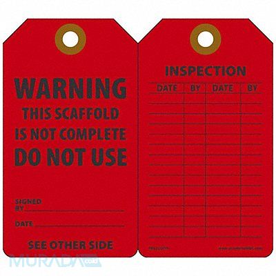 Tag Compatible Tag Holder Mfr Part Number TRS902 Compatible Tag Insert Mfr Part Number Not Applicable Fastener Attachment Length Not Applicable Fastener Type Not Applicable Header Wording (Reverse Side) Inspection Header Wording Warning Height 5 3/4 in Indoor/Outdoor Usage Indoor/Outdoor Lamination Type Not Laminated Language English Mounting Hole Reinforcement Type Brass Grommet Mounting Hole Size 3/8 in Number of Tags 25