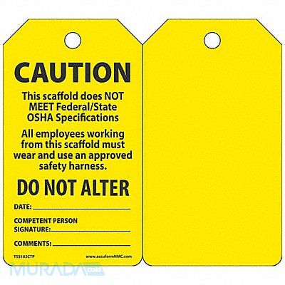 Tag Compatible Tag Holder Mfr Part Number TSS902 Compatible Tag Insert Mfr Part Number Not Applicable Fastener Attachment Length Not Applicable Fastener Type Not Applicable Header Wording (Reverse Side) No Header Header Wording Caution Height 5 3/4 in Indoor/Outdoor Usage Indoor/Outdoor Lamination Type Not Laminated Language English Mounting Hole Reinforcement Type No Grommet Mounting Hole Size 3/8 in Number of Tags 25 Preprinted Images (Reverse Side) Not Applicable
