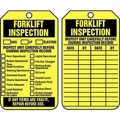 Tag Compatible Tag Holder Mfr Part Number TSS904 Compatible Tag Insert Mfr Part Number Not Applicable Fastener Attachment Length Not Applicable Fastener Type Not Applicable Header Wording (Reverse Side) Forklift Inspection Header Wording Forklift Inspection Height 5 3/4 in Indoor/Outdoor Usage Indoor/Outdoor Lamination Type Not Laminated Language English Mounting Hole Reinforcement Type Brass Grommet Mounting Hole Size 3/8 in Number of Tags 25