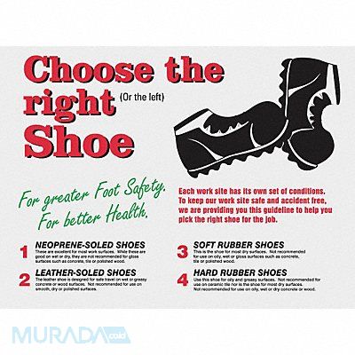 Poster Shape Vertical Rectangle Safety Banner Legend Choose The Right (Or The Left) Shoe For Greater Foot Safety For Better Health Sign Legend Style Symbol and Text Printed Language English Background Color White Number of Printed Sides 1 Width 17 in Height 22 in Thickness 0.024 in