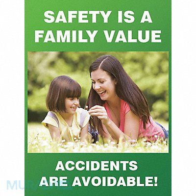 Poster Shape Vertical Rectangle Safety Banner Legend Safety Is A Family Value Accidents Are Avoidable Sign Legend Style Symbol and Text Printed Language English Background Color Green Number of Printed Sides 1 Width 17 in Height 22 in Thickness 0.024 in
