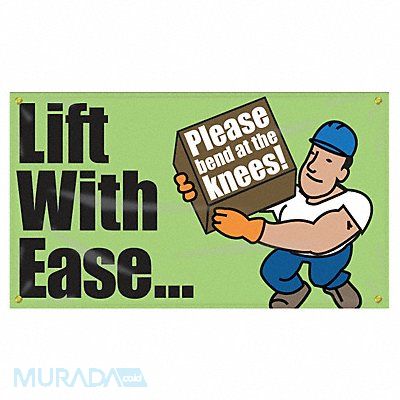Banner Shape Horizontal Rectangle Safety Banner Legend Lift With Ease ┐ Please Bend At The Knees Sign Legend Style Symbol and Text Printed Language English Background Color Green Number of Printed Sides 1 Width 48 in Height 28 in Thickness 0.013 in