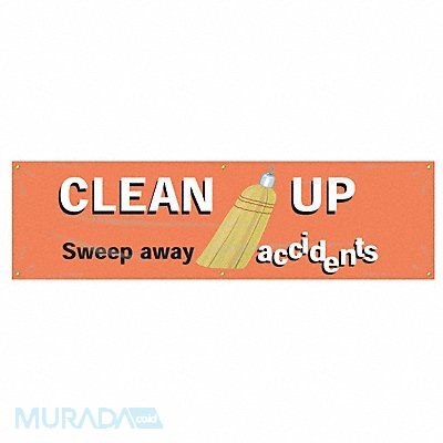 Banner Shape Horizontal Rectangle Safety Banner Legend Clean Up Sweep Away Accidents Sign Legend Style Symbol and Text Printed Language English Background Color Orange Number of Printed Sides 1 Width 96 in Height 28 in Thickness 0.013 in