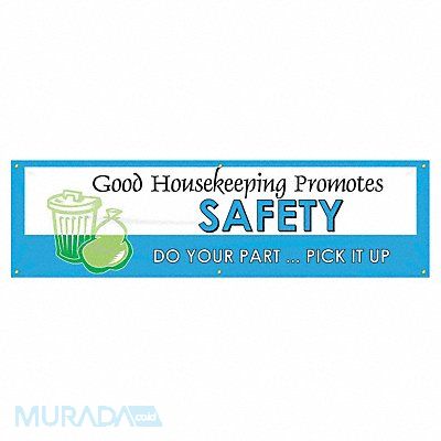 Banner Shape Horizontal Rectangle Safety Banner Legend Good Housekeeping Promotes Safety Do Your Part ┐ Pick It Up Sign Legend Style Symbol and Text Printed Language English Background Color Blue Number of Printed Sides 1 Width 96 in Height 28 in Thickness 0.013 in