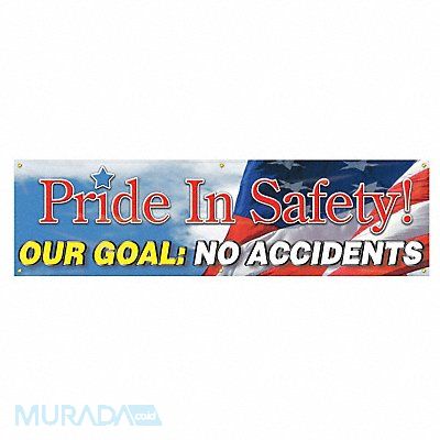 Banner Shape Horizontal Rectangle Safety Banner Legend Pride In Safety Our Goal No Accidents Sign Legend Style Symbol and Text Printed Language English Background Color Blue Number of Printed Sides 1 Width 96 in Height 28 in Thickness 0.013 in