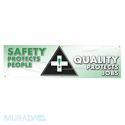 Banner Shape Horizontal Rectangle Safety Banner Legend Safety Protects People. Quality Protects Jobs Sign Legend Style Symbol and Text Printed Language English Background Color Green Number of Printed Sides 1 Width 96 in Height 28 in Thickness 0.013 in
