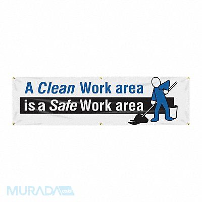 Banner Shape Horizontal Rectangle Safety Banner Legend A Clean Work Area Is A Safe Work Area Sign Legend Style Symbol and Text Printed Language English Background Color White Number of Printed Sides 1 Width 96 in Height 28 in Thickness 0.013 in