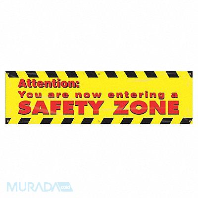 Banner Shape Horizontal Rectangle Safety Banner Legend Attention You Are Now Entering A Safety Zone Sign Legend Style Text Printed Language English Background Color Yellow Number of Printed Sides 1 Width 96 in Height 28 in Thickness 0.013 in