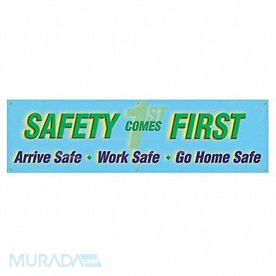Banner Shape Horizontal Rectangle Safety Banner Legend Safety Comes First. Arrive Safe. Work Safe. Go Home Safe Sign Legend Style Symbol and Text Printed Language English Background Color Blue Number of Printed Sides 1 Width 96 in Height 28 in Thickness 0.013 in