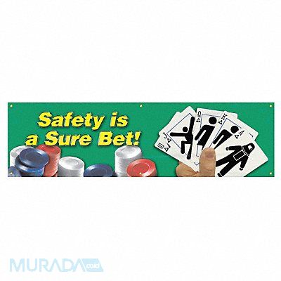 Banner Shape Horizontal Rectangle Safety Banner Legend Safety Is A Sure Bet! Sign Legend Style Symbol and Text Printed Language English Background Color Green Number of Printed Sides 1 Width 96 in Height 28 in Thickness 0.013 in