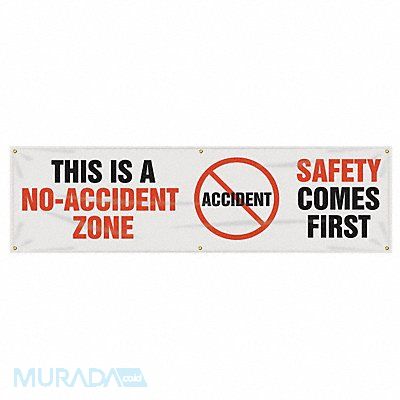 Banner Shape Horizontal Rectangle Safety Banner Legend This Is A No-Accident Zone Safety Comes First Sign Legend Style Symbol and Text Printed Language English Background Color White Number of Printed Sides 1 Width 96 in Height 28 in Thickness 0.013 in