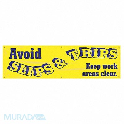 Banner Shape Horizontal Rectangle Safety Banner Legend Avoid Slips Trips Keep Work Areas Clear Sign Legend Style Text Printed Language English Background Color Yellow Number of Printed Sides 1 Width 96 in Height 28 in Thickness 0.013 in