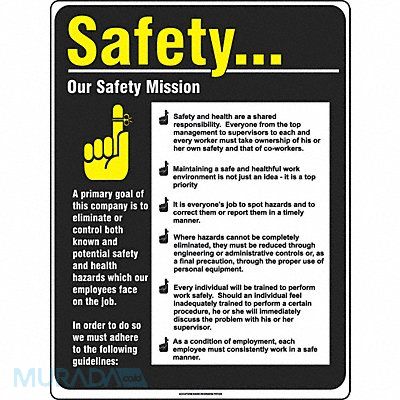 Safety Poster Shape Vertical Rectangle Safety Banner Legend Safety. . . Our Safety Mission Sign Legend Style Symbol and Text Printed Language English Background Color Black Number of Printed Sides 1 Width 17 in Height 22 in Thickness 0.024 in