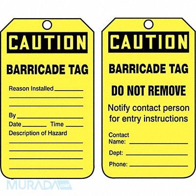 Caution Tag Subject Matter Status Alert Sign Legend Barricade Tag Legend Same on Both Sides No Sign Header Caution Sign Header Background Color Black Tag Style Single Part Shape Rectangular Safety Tag Legend - Back Side Barricade Tag Do Not Remove Notify Contact Person For Entry Instructions Sign Header -Back Side Caution Package Quantity 25