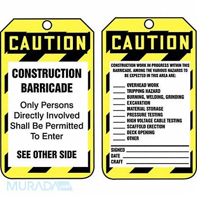Caution Tag Subject Matter Status Alert Sign Legend Construction Barricade Legend Same on Both Sides No Sign Header Barricade Sign Header Background Color Black Tag Style Single Part Shape Rectangular Safety Tag Legend - Back Side Construction Work In Progress Within This Barricade Sign Header -Back Side Barricade Package Quantity 25