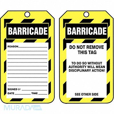 Barricade Tag Subject Matter Status Alert Sign Legend Barricade Reason Legend Same on Both Sides No Sign Header Barricade Sign Header Background Color Black Tag Style Single Part Shape Rectangular Safety Tag Legend - Back Side Barricade Do Not Remove This Tag To Do So Without Authority Will Mean Disciplinary Action! Sign Header -Back Side Barricade Package Quantity 25
