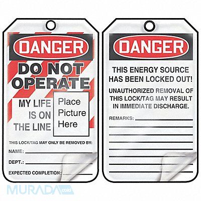 Danger Tag Front Side Legend Danger Do Not Operate Header Danger Language English Legend Type Text Number of Printed Sides 2 Overall Height 5 3/4 in Overall Width 3 1/4 in Reverse Side Legend This Energy Source is Locked Out Sign Background Color Red/White Sign Material RP-Plastic Sign Out Sections Additional Notes Completion Date Personnel involved Signage Type Tag Write-On Surface Yes For Location Indoor Outdoor For Use With Lockout Tagout Grommet Material Metal