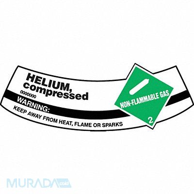 Cylinder Label Arch Number of Printed Sides 1 English Sign Format Other Format Sign Legend Helium Compressed Non-Flammable Gas Warning Keep Away From Heat Flame Or Sparks Sign Legend Background Color Black Green White Sign Legend Style Symbol and Text