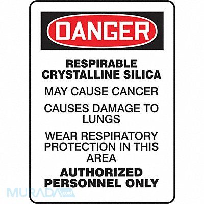 Danger Sign Vertical Rectangle Number of Printed Sides 1 English Sign Format Traditional OSHA Sign Legend Respirable Crystalline Silica May Cause Cancer Causes Damage To Lungs Wear Respiratory Protection In This Area Authorized Personnel Only Sign Legend Background Color White Sign Legend Style Text
