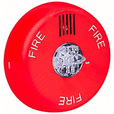 Audible Alarm Type Horn Visual Indicator Type Strobe Voltage 24 V Decibels 86 dBA Sound Pattern Continuous/Pulse Indoor/Outdoor Indoor Mounting Ceiling Height 1.91 in Width 6.27 in Diameter 6.23 in Lens Color Clear Current Drawn 0.022 DC 0.03 DC 0.06 DC 0.086 DC 0.125 DC 0.185 DC Housing Color Red Lens Material Lexan(R) Housing Material Plastic Lens Design LED Light Output 185 cd Lamp Type LED Lamp Life 100 000 hr Operating Temp 32 Degrees to 122 Degrees F