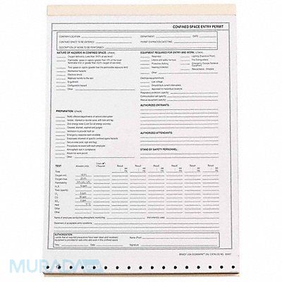 Confined Space Entry Permit Accessory Type Confined Space Entry Permit Includes Tie-Off Anchor Point Not Applicable Length Not Applicable Color Black White For Use With Mfr No PC1 Confined Space Component Permit Material 2-Ply Carbonless Width 8 1/2 in Height 11 in Series Not Applicable Package Quantity 25