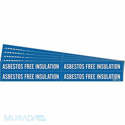 Pipe Marker Pipe Marker Mounting Style Adhesive Pipe Marker Pipe Marker Legend Asbestos Free Insulation Legend Text Color White IIAR System Abbreviation Not Applicable IIAR Phase Not Applicable IIAR Pressure Level Not Applicable Character Height 3/4 in Background Color Blue With or Without Arrows Without Package Quantity 5