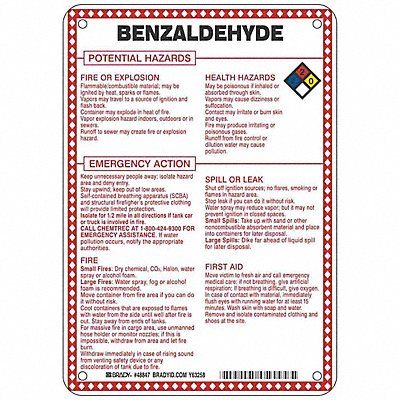 Chemical Sign Benzaldehyde Potential Hazards Fiberglass Height 10 in Width 7 in Header No Header Legend Style Symbol and Text Language English Mounting Style Surface Thickness 0.1 in Sign Shape Rectangle Operating Temp Range -40 Degrees to 194 Degrees F Retroreflective Grade Not Retroreflective