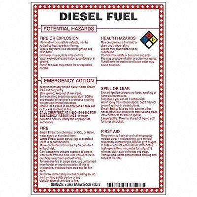 Chemical Sign Diesel Fuel Potential Hazards Fiberglass Height 10 in Width 7 in Header No Header Legend Style Symbol and Text Language English Mounting Style Surface Thickness 0.1 in Sign Shape Rectangle Operating Temp Range -40 Degrees to 194 Degrees F Retroreflective Grade Not Retroreflective