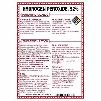 Chemical Sign Hydrogen Peroxide 52 Percent Potential Hazards Fiberglass Height 10 in Width 7 in Header No Header Legend Style Symbol and Text Language English Mounting Style Surface Thickness 0.1 in Sign Shape Rectangle Operating Temp Range -40 Degrees to 194 Degrees F Retroreflective Grade Not Retroreflective