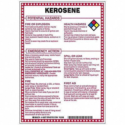 Chemical Sign Kerosene Potential Hazards Fiberglass Height 10 in Width 7 in Header No Header Legend Style Symbol and Text Language English Mounting Style Surface Thickness 0.1 in Sign Shape Rectangle Operating Temp Range -40 Degrees to 194 Degrees F Retroreflective Grade Not Retroreflective