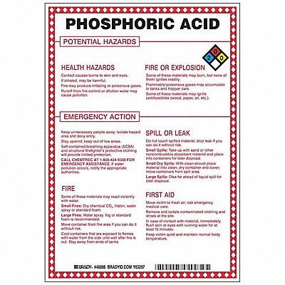 Chemical Sign Phosphoric Acid Potential Hazards Fiberglass Height 10 in Width 7 in Header No Header Legend Style Symbol and Text Language English Mounting Style Surface Thickness 0.1 in Sign Shape Rectangle Operating Temp Range -40 Degrees to 194 Degrees F Retroreflective Grade Not Retroreflective