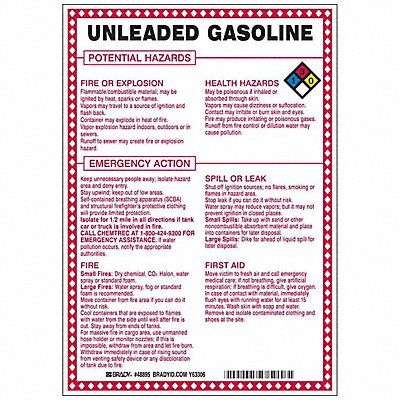 Chemical Sign Unleaded Gasoline Potential Hazards Fiberglass Height 10 in Width 7 in Header No Header Legend Style Symbol and Text Language English Mounting Style Surface Thickness 0.1 in Sign Shape Rectangle Operating Temp Range -40 Degrees to 194 Degrees F Retroreflective Grade Not Retroreflective