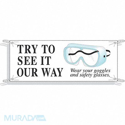 Safety Banner Shape Horizontal Rectangle Safety Banner Legend Try To See It Our Way Wear Your Goggles And Safety Glasses Sign Legend Style Symbol and Text Printed Language English Background Color White Number of Printed Sides 1 Width 120 in Height 48 in Thickness 0.055 in