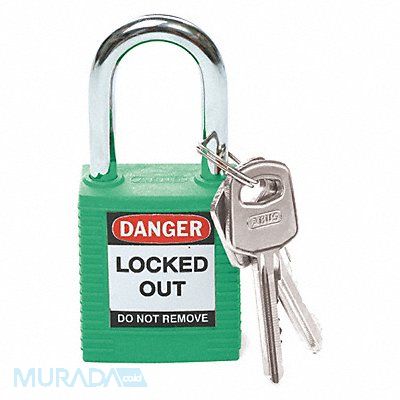 D1949 Lockout Padlock Body Color Green Body Height 1 3/4 in Body Material Nylon Body Thickness 41/50 in Body Width 1 1/2 in Header Danger Horizontal Shackle Clearance 4/5 in Key Style Standard Key Type Keyed Different Non-Removable Key Yes Resistance Properties Chemical Resistant Corrosion Resistant Temperature Resistant Shackle Diameter 1/4 in Shackle Height 1 1/2 in Shackle Material Hardened Steel Shackle Type Open Vertical Shackle Clearance 1 1/2 in Width Across Shackle 3/4 in