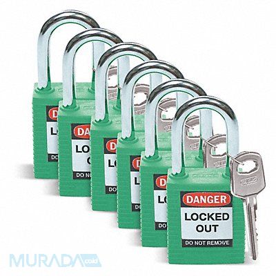 D1951 Lockout Padlock Body Color Green Body Height 1 3/4 in Body Material Nylon Body Thickness 41/50 in Body Width 1 1/2 in Header Danger Horizontal Shackle Clearance 4/5 in Key Style Standard Key Type Keyed Different Non-Removable Key Yes Resistance Properties Chemical Resistant Corrosion Resistant Temperature Resistant Shackle Diameter 1/4 in Shackle Height 1 1/2 in Shackle Material Hardened Steel Shackle Type Open Vertical Shackle Clearance 1 1/2 in Width Across Shackle 3/4 in