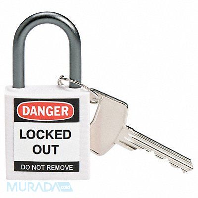 Lockout Padlock Body Color White Body Height 1 2/5 in Body Material Nylon Body Thickness 5/8 in Body Width 1 1/5 in Header Danger Key Style Standard Key Type Keyed Alike Non-Removable Key Yes Resistance Properties Chemical Resistant Corrosion Resistant Temperature Resistant Shackle Diameter 1/5 in Shackle Height 1 in Shackle Material Aluminum Shackle Type Open Vertical Shackle Clearance 1 in Width Across Shackle 3/4 in Body Shape Rectangular