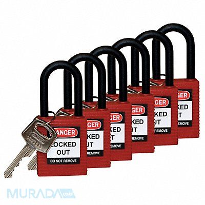 H1707 Lockout Padlock Body Color Red Body Height 1 3/4 in Body Material Nylon Body Thickness 41/50 in Body Width 1 1/2 in Header Danger Horizontal Shackle Clearance 4/5 in Key Style Standard Key Type Keyed Alike Non-Removable Key Yes Resistance Properties Chemical Resistant Corrosion Resistant Temperature Resistant Shackle Diameter 1/4 in Shackle Height 1 1/2 in Shackle Material Nylon Shackle Type Open Vertical Shackle Clearance 1 1/2 in Width Across Shackle 3/4 in