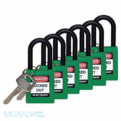 H1707 Lockout Padlock Body Color Green Body Height 1 3/4 in Body Material Nylon Body Thickness 41/50 in Body Width 1 1/2 in Header Danger Horizontal Shackle Clearance 4/5 in Key Style Standard Key Type Keyed Alike Non-Removable Key Yes Resistance Properties Chemical Resistant Corrosion Resistant Temperature Resistant Shackle Diameter 1/4 in Shackle Height 1 1/2 in Shackle Material Nylon Shackle Type Open Vertical Shackle Clearance 1 1/2 in Width Across Shackle 3/4 in