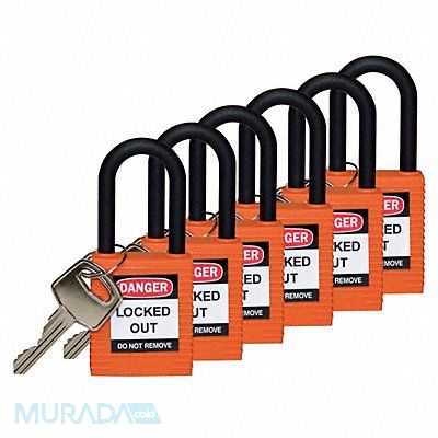 H1707 Lockout Padlock Body Color Orange Body Height 1 3/4 in Body Material Nylon Body Thickness 41/50 in Body Width 1 1/2 in Header Danger Horizontal Shackle Clearance 4/5 in Key Style Standard Key Type Keyed Alike Non-Removable Key Yes Resistance Properties Chemical Resistant Corrosion Resistant Temperature Resistant Shackle Diameter 1/4 in Shackle Height 1 1/2 in Shackle Material Nylon Shackle Type Open Vertical Shackle Clearance 1 1/2 in Width Across Shackle 3/4 in